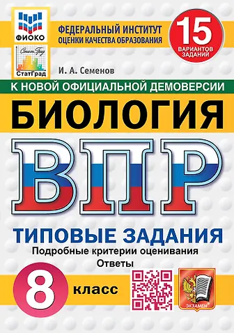 Данное пособие полностью соответствует федеральному государственному образовательному стандарту. Книга содержит 15 вариантов типовых заданий Всероссийской проверочной работы (ВПР) по биологии для учащихся 8-х классов. Сборник предназначен учащимся 8-х классов, учителям и методистам, использующим типовые задания для подготовки к Всероссийской проверочной работе по биологии.