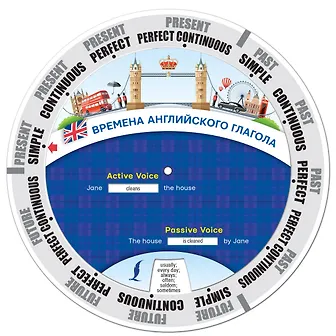 Чтобы систематизировать информацию, полученную в школе (к сожалению, зачастую дается информация не взаимосвязанная, а обрывочная), купили данную вертушку "Времена английского глагола". Довольно-таки плотный (ламинированный) картон. Представлены 12 времен. Схематично на примере (пассивном и активном) всё понятно. На обратной стороне представлены правила (какие вспомогательные слова используются в тех или иных случаях). Ребенок оценил.