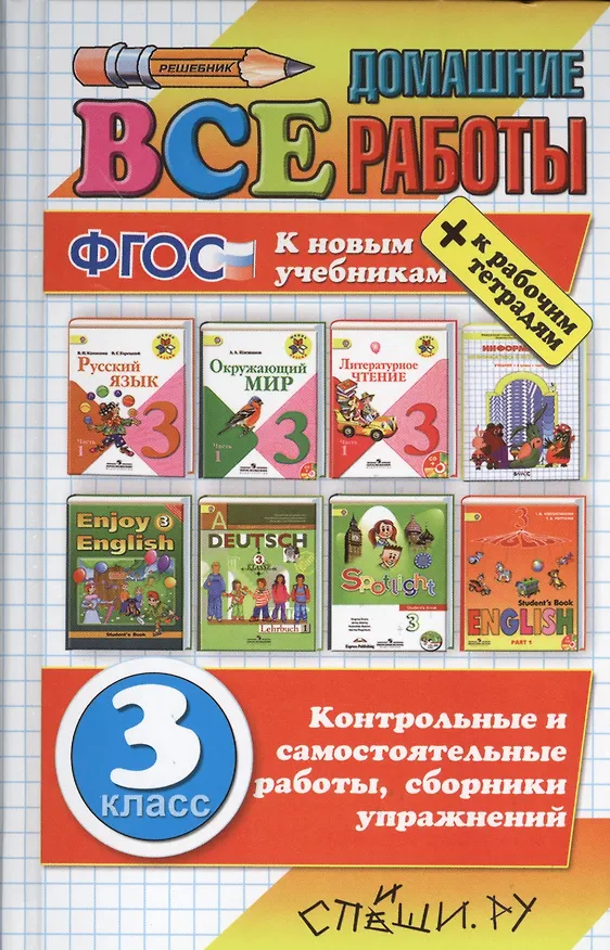 ГДЗ. В данном учебном пособии решены и в большинстве случаев подробно разобраны задачи и упражнения по РУССКОМУ ЯЗЫКУ, МАТЕМАТИКЕ, ЛИТЕРАТУРНОМУ ЧТЕНИЮ, ОКРУЖАЮЩЕМУ МИРУ, ИНФОРМАТИКЕ, НЕМЕЦКОМУ и АНГЛИЙСКОМУ ЯЗЫКАМ из ВСЕХ основных учебников начальной школы для 3 класса, а также из рабочих тетрадей к этим учебникам.