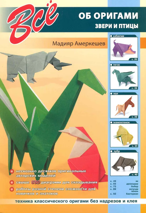 Книга знакомит любителей оригами с тридцатью авторскими моделями Мадияра Амеркешева разного уровня сложности. С некоторыми из них могут справиться и новички, другие требуют определенного навыка работы. Большинство моделей сборника являются фигурками зверей и птиц. Мифических созданий представляют дракон и пегас. Автор нередко играет с двумя цветами бумаги - лицевой и оборотной стороной квадрата. В результате получаются такие изящные работы как снегирь и кабанчик, мамонтенок и летучая мышь-вампир. Помимо традиционных фигурок животных автор предлагает сложить голову оленя, имитирующую охотничьи трофеи германских феодалов. Среди других оригинальных находок мышь-коробка; эта работа развивает сер