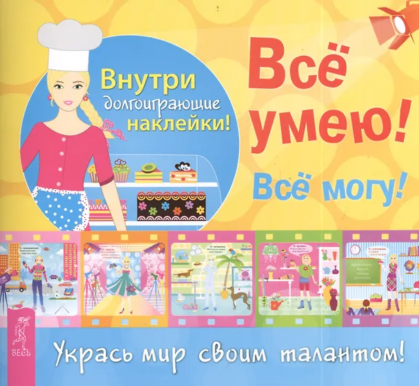 Стать журналистом, который поведает миру о сногсшибательной сенсации, или ветеринаром, который может спасти любую зверушку от болезни? А может быть, твое призвание - создавать восхитительные пирожные или самые стильные прически на свете? Ты можешь быть стюардессой, учительницей, врачом, моделью или суперзвездой… Прямо сейчас! Определиться с профессией ты еще успеешь, а сейчас - играй с удовольствием, экспериментируй! Попробуй всё - и выбери то, что нравится больше всего! О чем книга Яркая книжка с долгоиграющими наклейками ВСЁ УМЕЮ! ВСЁ МОГУ! - это увлекательный иллюстрированный рассказ в картинках о том, какие замечательные возможности откроются перед вашей дочкой в будущем. Любая профессия