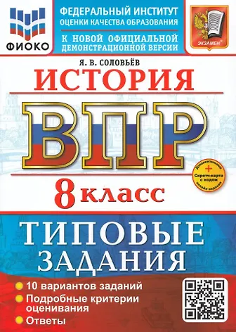 Данное пособие полностью соответствует федеральному государственному образовательному стандарту. Книга содержит 10 вариантов типовых заданий Всероссийской проверочной работы (ВПР) по истории для учащихся 8-х классов. Сборник предназначен учащимся 8-х классов, учителям и методистам, использующим типовые задания для подготовки к Всероссийской проверочной работе по истории. Я. В. Соловьёв - кандидат исторических наук, доцент кафедры истории России Государственного университета просвещения, старший научный сотрудник Научно-просветительского отдела Государственной публичной исторической библиотеки России, автор пособий по истории России, ЕГЭ, ОГЭ и ВПР.