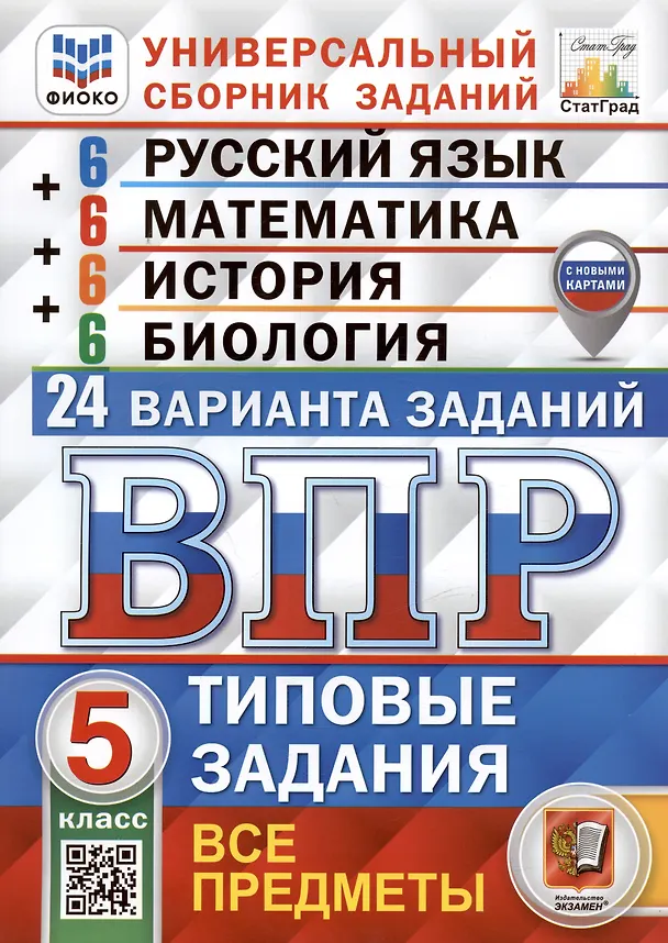 Данное пособие полностью соответствует федеральному государственному образовательному стандарту. Книга содержит 24 варианта типовых заданий Всероссийской проверочной работы (ВПР) за курс 5-го класса по четырем предметам (по 6 вариантов). Сборник предназначен учащимся 5-х классов, учителям и методистам, использующим типовые задания для подготовки к Всероссийской проверочной работе за курс 5-го класса.