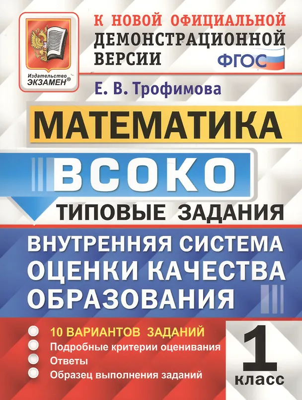 Данное пособие полностью соответствует федеральному государственному образовательному стандарту (второго поколения) для начальной школы. Книга содержит 10 вариантов типовых заданий ВСОКО (внутренняя система оценки качества образования) за курс 1-го класса. Назначение пособия - отработка практических навыков учащихся по математике при подготовке к внутренней системе оценки качества образования. Ответы к заданиям всех вариантов являются материалами для учителя, а потому даны в середине пособия и могут быть легко изъяты, что повышает объективность оценки знаний учащихся. Сборник предназначен учащимся 1-х классов начальной школы, учителям и методистам, использующим типовые задания для подготовки