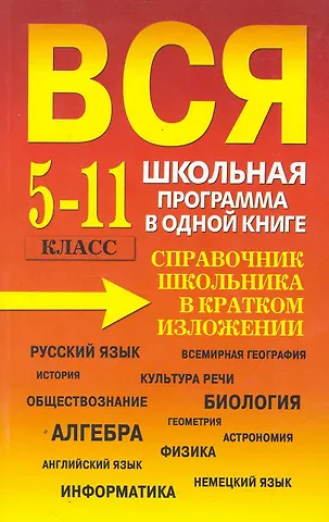 Данное пособие предназначено для учащихся 5-11-х классов. В справочнике содержатся все необходимые сведения, которые позволят школьнику быстро подготовить доклад, домашнее задание и самостоятельно освоить пропущенные темы, помогут подготовиться к контрольной работе, диктанту, а также к экзаменам по всем предметам школьной программы, включая английский и немецкий языки.