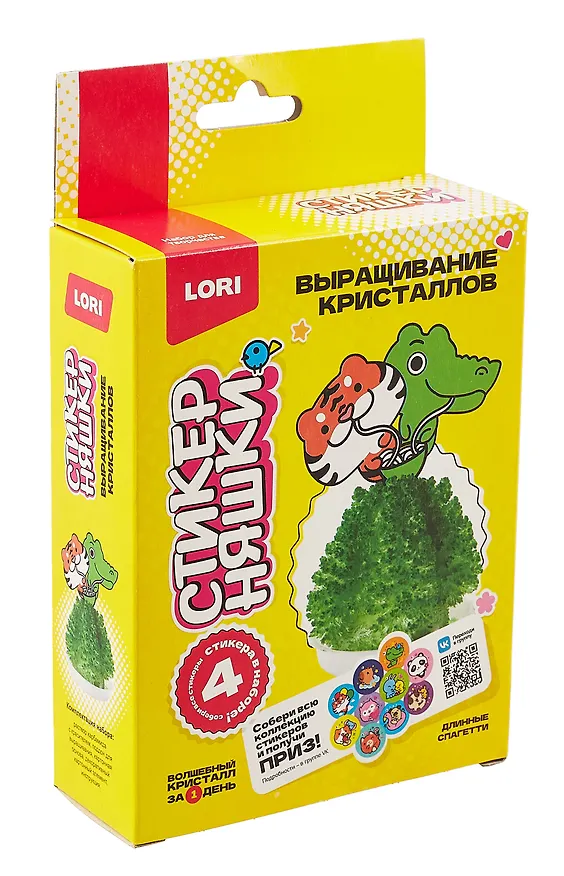 Выращивание кристаллов Стикерняшки "Длинные спагетти", зелёный кристалл. Комплектация: Раствор карбамида и поливинилового спирта с красителем, поддон для выращивания, картонная основа, декоративный картонный элемент, инструкция, стикеры 4 шт.