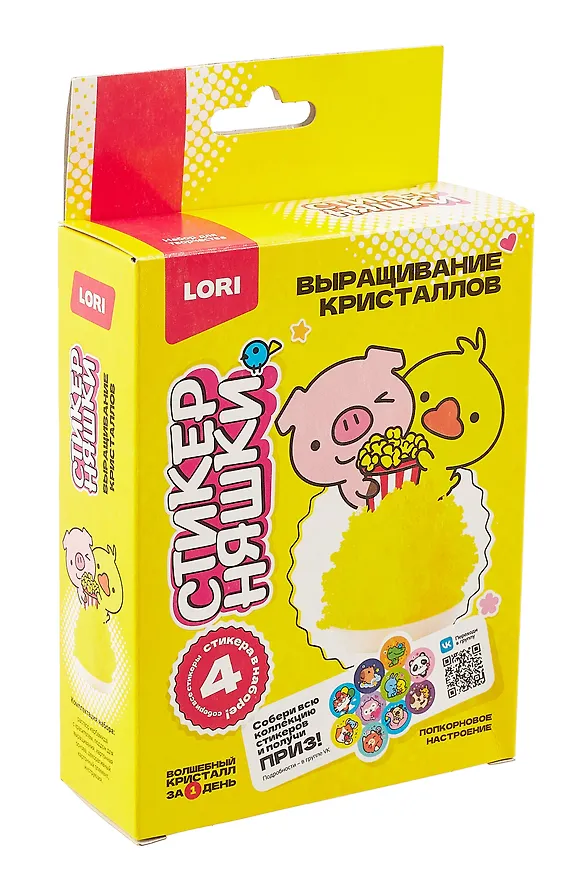Выращивание кристаллов Стикерняшки "Попкорновое настроение", жёлтый кристалл. Комплектация: Раствор карбамида и поливинилового спирта с красителем, поддон для выращивания, картонная основа, декоративный картонный элемент, инструкция, стикеры 4 шт.