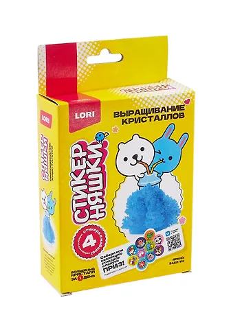 Выращивание кристаллов Стикерняшки "Яркий бабл ти", голубой кристалл. Комплектация: Раствор карбамида и поливинилового спирта с красителем, поддон для выращивания, картонная основа, декоративный картонный элемент, инструкция, стикеры 4 шт.