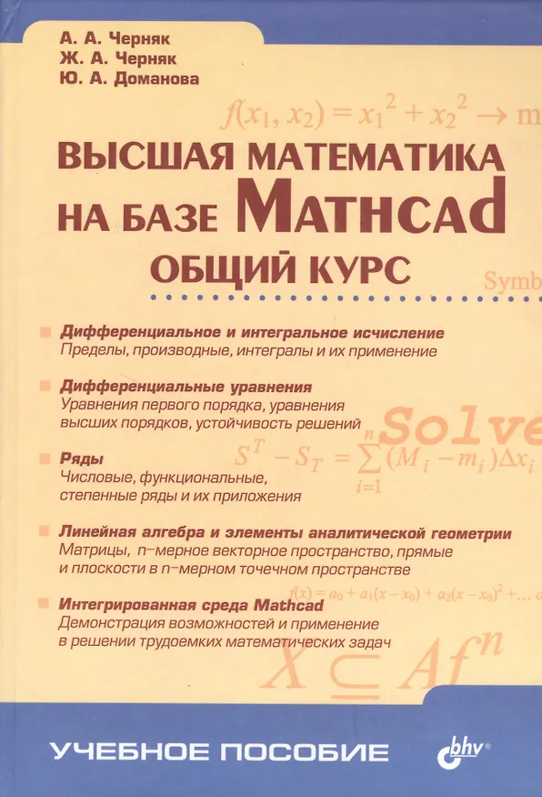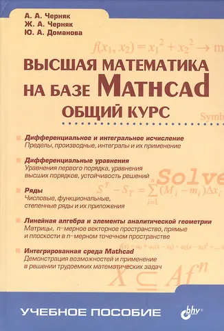 Учебное пособие охватывает следующие разделы высшей математики: дифференциальное и интегральное исчисление, дифференциальные уравнения, ряды, линейная алгебра и элементы аналитической геометрии, а также описание интегрированной среды Mathcad. Содержание теоретического материала соответствует государственным образовательным стандартам преподавания общего курса высшей математики на экономических и инженерно-технических специальностях вузов. Возможности компьютерного пакета Mathcad демонстрируются с помощью алгоритмов решения трудоемких вычислительных задач.