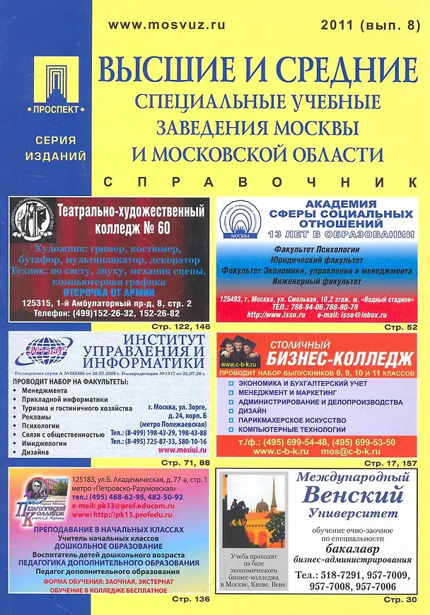 Уважаемые читатели, перед вами специализированное справочное издание о более чем 500 специальностей обучения, 300 высших и средних специальных учебных заведениях, подготовительных курсах, втором высшем образовании, учебных центрах Москвы и Московской области. Информация в справочнике представлена следующими разделами: "Университеты", "Академии", "Институты", "Высшие школы", "Колледжи, техникумы, лицеи, училища", "Довузовская подготовка", а также собрана в отдельно выделенные тематические рубрики по направлениям образования: "Военное образование", "Медицинское образование", "Творческое образование", "Духовное образование" и "Дополнительное образование". Мы проверили, обобщили и систематизиров