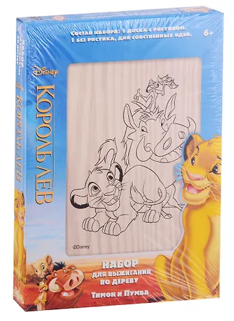 Набор состоит из двух дощечек (фанерок) размером 21 на 15 сантиметров, толщиной 4 мм. Одна дощечка чистая, для самостоятельного творчества, а на вторую нанесен простой контурный рисунок с Тимоном, Пумбой и Симбой. Этот рисунок идеально подходит для детей, которые только пробуют свои силы в искусстве выжигания и не потребуют от ребенка старше 6 лет чрезмерной усидчивости, а достижение начального хорошего результата стимулирует его для дальнейшего «творчества».