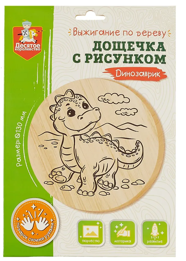 Искала что-то интересное для творчества. Увидела этого динозаврика и не смогла "пройти" мимо. Невероятно милое, доброе и симпатичное изображение замечательного динозавра. Заказала - пришёл быстро. Изображение напечатано на небольшой круглой фанерке. Качество печати просто отличное - всё чётко и ярко. Выжигать не стала, решила оставить и так. Если руки дойдут - попробую расписать. Можно использовать в этих же целях и для деток - фанерка гладкая, занозок не будет!