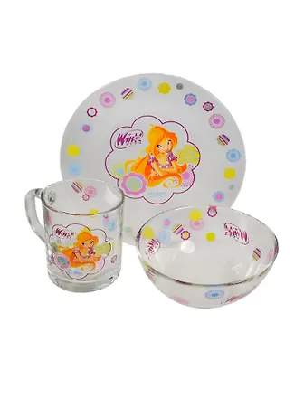 Набор стеклянной посуды Winx "Bloom" - состоит из трех предметов: салатника, мелкой тарелки и кружки. Посуда допускает использование её в микроволновой печи и мытьё в посудомоечной машине. Больше всего на свете Блум любит готовить капкейки! Угощайся с тарелки с изображением любимой героини. Поклонницам сериала придется по душе яркий принт. Яркие цветы по краю тарелки поднимают настроение и улучшают аппетит.