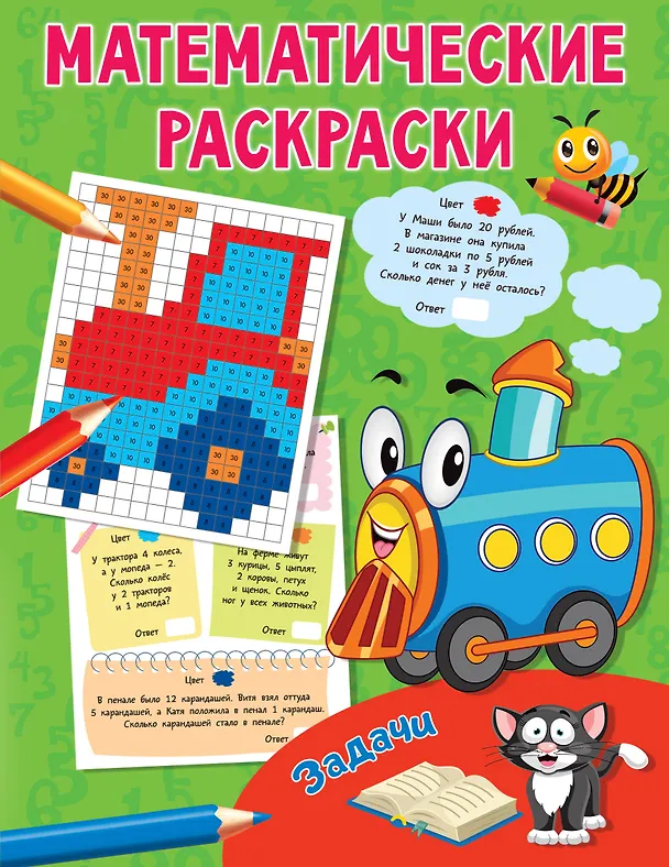 Развивающая книжка «Задачи» — это одновременно и сборник математических задач для учеников младших классов, и замечательная раскраска. Выполняя задания и раскрашивая клеточки по числам-ответам, ребёнок будет создавать красочные картинки.