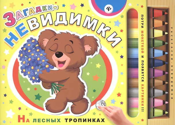 Эта книжка — загадочная и волшебная! Она полна сюрпризов! На абсолютно белых участках её страниц спрятались весёлые персонажи. Аккуратно потри монеткой страничку — и появится картинка-отгадка, которую можно раскрасить карандашами или фломастерами.