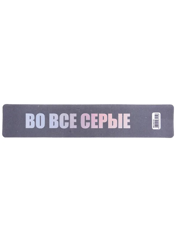 На лицевой стороне закладки фон серого цвет и цветная ироничная надпись "Во все серые", а также не очень симпатичный штрихкод, который смазывает впечатление (лучше бы штрихкод был на наклейке или напечатан сзади), оборотная сторона просто белая.