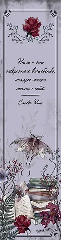 Очень красивая закладка с прекрасным дизайном и качественным исполнением. Выполнена из плотного картона, очень приятно пользоваться такой закладкой. Для любителей Стивена Кинга на закладке приведена его цитата, это и послужило причиной выбора и покупки именно этого варианта.