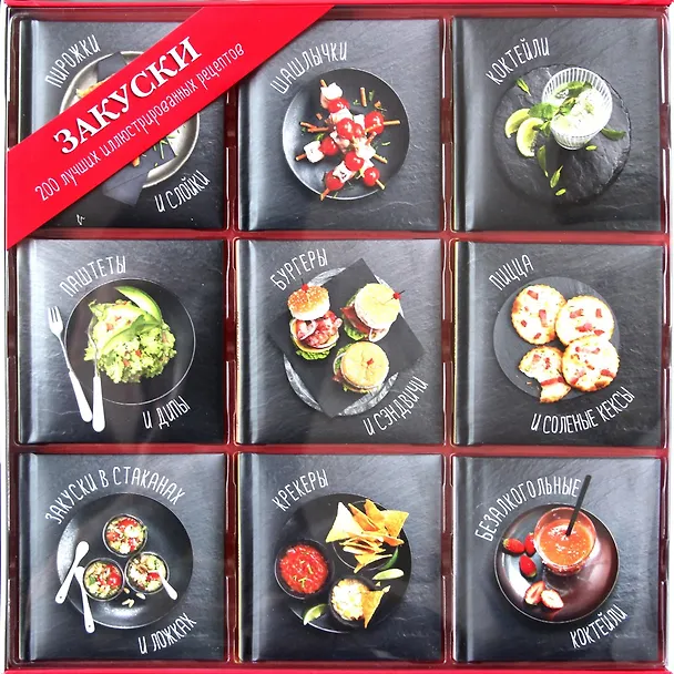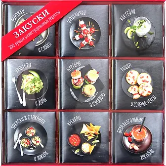 Закуски 200 лучших иллюстрированных рецептов. Прекрасный подарок- в меру дорогой, изящный, на хорошей бумаге и с качественными фотографиями. В наборе 9 книг, они все упакованы в коробку. Сбрасывались всем отделом на этот подарок нашей коллеге. Всем очень понравилось, девушка уже несколько блюд приносила- сожрали вмиг. Хотела бы и себе такой комплект- но увы, пока это мечты
