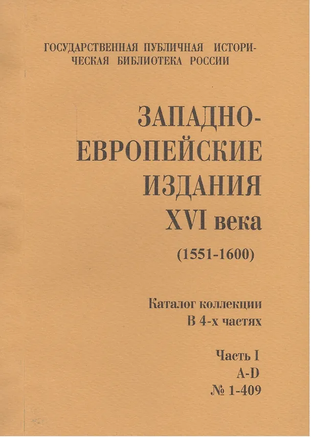 . Западно-европейские издания XVI века. Часть 1. Каталог, выпущенный в 4-х частях, включает издания второй половины XVI в. (1551-1600), хранящиеся в отделе редкой книги Исторической библиотеки. В последней части содержатся указатели: имен и заглавий; мест издания, печати или продажи; имен печатников, издателей или книготорговцев; художников, граверов и переплетчиков; экземпляров, на переплетах которых использованы пергаментные листы с рукописным старым текстом или рукописными нотами; владельцев штампов, экслибрисов, суперэкслибрисов, рукописных надписей и книгопродавческих наклеек и штампов. Выделены отдельным списком автографы, безымянные экслибрисы, суперэкслибрисы и штампы, дарственные надписи, экземпляры с указанием цены на книге. Книга 2