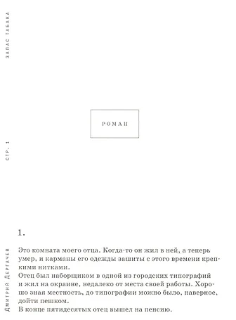 «Запас табака» — авторепортаж о путешествии главного героя в места, где жил его недавно скончавшийся отец. Получив анонимное извещение о смерти, герой отправляется в незнакомый город — неодушевленный, негостеприимный и в то же время оживленный — чтобы без цели, но и без страха исследовать свою новую жизнь. Этим поиском Дергачев воссоздаёт плотную и гнетущую атмосферу, погружаясь в которую, читатель становится дезориентированным настолько, что поневоле начинает задаваться вопросом, а не исследует ли он царство мертвых.