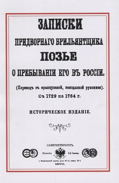 Эти воспоминания не выходили в виде отдельной книге, а печатались только в журнале Русская Старина. Жереми Позье (1716 Женева – 1776 Женкева) гугенот. В 1729 году Жереми Позье вместе с отцом Этьеном прибыл в Россию по приглашению своего дяди, служившего хирургом при дворе Петра II Отец и сын путешествовали в Санкт Петербург пешком через Швейцарию, Германию и Голландию. После краткосрочной службы в армии под Архангельском (1730—1731) и смерти отца, молодой Жереми Позье получил пост подручного в мастерской французского граверовщика камней Бенуа Граверо, где он проучился семь лет (1732-39). Молодой ученик превзошел мастерством своего учителя, и скоро привлек внимание императрицы Анны Иоанновны,