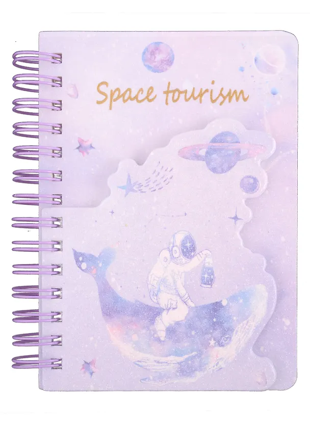 Обложка блокнота из плотного картона с блёстками. Сам блокнот состоит из 2 частей - фигурные листики с двумя планетами и звездой на каждой странице и основные листы с линовкой в линию и надпись внизу "good luck to meet you" мелкими буквами. Страницы кремового цвета гладкие. Страна производитель Китай. Размер страниц 9 на 13 сантиметров. Купила блокнот ребенку, такая обложка создаёт мечтательное настроение и фиолетовый - любимый цвет.