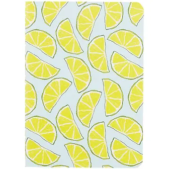 Замечательная записная книжка. Вся прелесть в мелочах. Тонкая картонная обложка, матового покрытия, с рельефом как мятая бумага. Цвет нежно-голубой с насыщенно жёлтыми лимонами. Внутренний блок на сшивке, выглядит очень стильно. Листы не белые, а бежевые, в клетку (которая прорисована пунктиром), разметка не доходит до края листа, то есть на развороте по периметру будет чистая рамка. Первый лист без разметки в клетку, с парой строк для записи, а в низу листа надпись "for happy thoughts and positive thinking". Последний лист тоже без разметки и в низу листа надпись "the end".