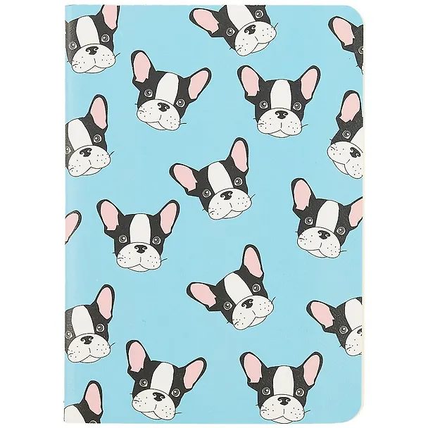 очень красивая и интересная записная книжка с милыми французскими бульдожками. Обложка яркая,привлекает внимание, но мягкая. Листы плотные,бумага жëлтая. Разлиновка нежная серая,не рябит и не бросается в глаза. формат записной книжки маленький и очень компактный,удобно брать ее с собой. проклеена записная книжка очень хорошо и прочно,ее можно смело открывать на полную,не боясь что она развалится.
