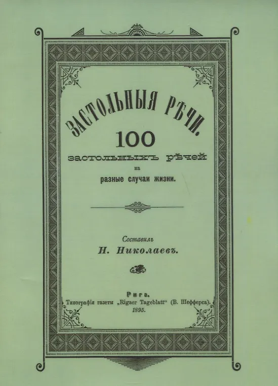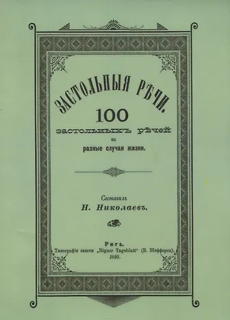 Книга содержит застольные речи, применимые к разным событиям жизни, семейным и общественным: новоселье, свадьба, именины, рождение, крестины, получение диплома, совершеннолетие, чествование юбиляров и др. Тексты речей включают пословицы, цитаты, праздничные песни и дают представление о культуре русского застолья XIX в.