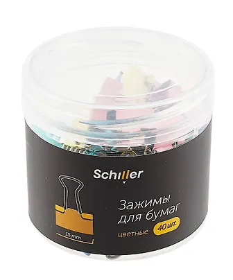 Набор цветных зажимов для бумаги. В комплекте – 40 штук, размер – 15 мм. Изготовлены из стали, устойчивы к механическому воздействию. Предназначены для скрепления документов без использования степлера, не деформируют бумагу, позволяют сцепить большое количество листов.