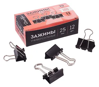 Изготовлены из стали с черным покрытием. Позволяют скреплять до 100 листов. Не деформируют бумагу. Ширина зажима - 25 мм. Поставляются по 12 штук в картонной коробке.