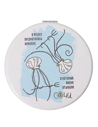Мягкое зеркало «Хинкали‑медузы, рыбки» (7 см) — оригинальный сувенирный аксессуар из Сочи, сочетающий функциональность мини‑зеркала с фантазийным художественным оформлением. На поверхности изображены причудливые образы: трансформированные хинкали в виде медуз и игривые рыбки. Изделие станет не только удобным карманным зеркалом, но и ярким подарком, отражающим творческий микс кулинарных и морских мотивов черноморского региона.