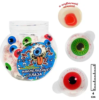Вкусный мармелад в необычном оформлении. Подойдёт для тематических вечеринок или если вы вдруг захотите отпраздновать Хэллоуин. Цвет зрачков разный. На вкус - ягодный, приятный - обычный жевательный мармелад.