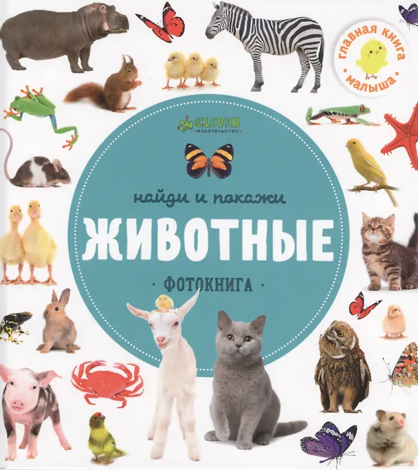 Фотокнига животные для малыша. Обложка плотный картон, лощеные белые страницы, красочные фотографии.