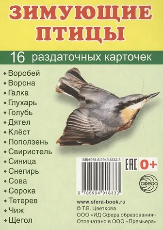 Карточки выполнены красочно и ярко, на каждой из них изображена птица, живущая зимой. Размер карточек (6,3х8,7см) оптимальный для того, чтобы детям их было интересно рассматривать.Мы обсуждали, какие птицы называются зимующими и как они защищают себя от холода. Дети узнали новые слова и научились употреблять их в своей речи.