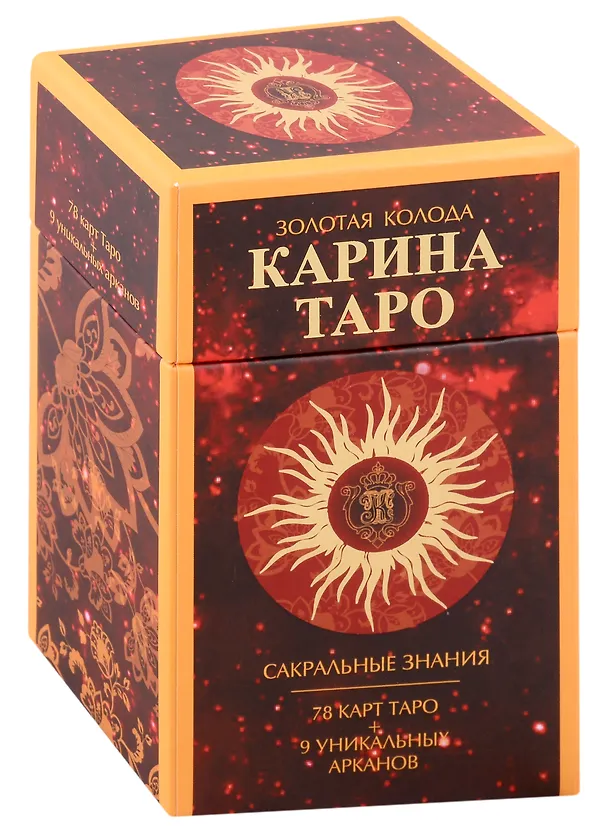 В ваших руках авторская колода, Карина Таро в эксклюзивной версии с позолоченным обрезом. В колоде собран весь многолетний практический опыт предсказаний и знания Автора, которыми теперь можете воспользоваться и Вы. Колода уникальна точностью прорисовки изображений. Так же в колоде собраны символы в виде информационных значков, вся необходимая информация об астрологических и планетарных соответствиях, времени года, времени суток, полу ребенка или взрослого человека, количеству детей и стихии, которой соответствует каждая карта. Эта информация делает ваши предсказания более точным и облегчает толкование раскладов. Колода содержит 9 дополнительных авторских арканов, которые более точно отражаю