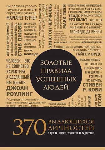 На страницах «Золотых правил» знаменитые бизнесмены, политики, писатели, музыканты, актеры и режиссеры рассказывают о сделанных ими открытиях на пути к успеху. Стив Джобс, Джоан Роулинг, Генри Форд, Уолт Дисней, Рей Бредбери и многие другие делятся своими лайфхаками по тому, как ставить цели, преодолевать страхи, относиться к критике, рискам, стрессу и т.д. Очень вдохновляющая книга. Помогает в минуты сомнений обрести уверенность в себе и прилив энергии.