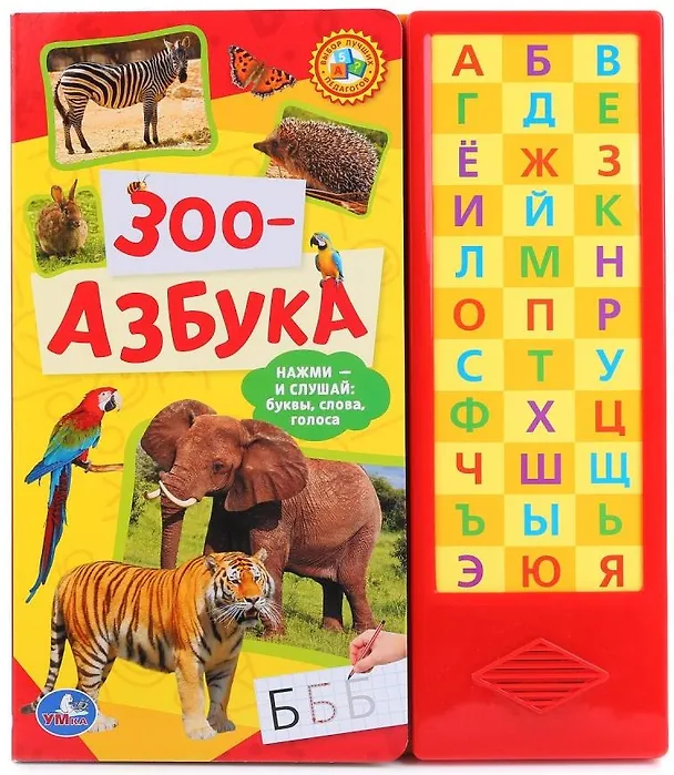 Эта азбука учит сразу многим вещам. Различать животных и узнавать их названия, узнать с каких букв начинаются слова, научиться писать печатные буквы. к каждой букве на странице прилагается своя иллюстрация, изображающая животное, а под ней находится линейка с примером начертания буквы, где можно писать.