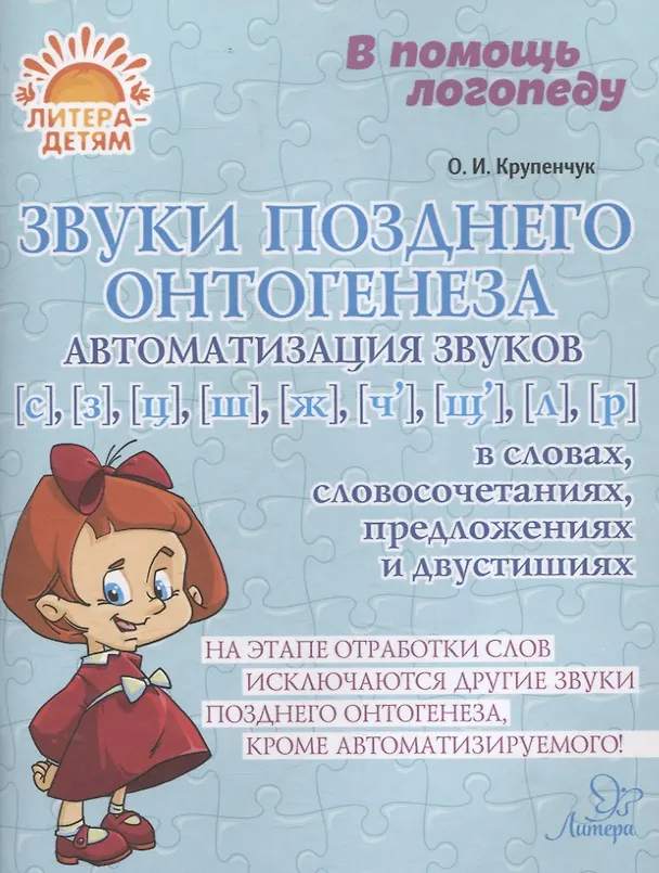 В книге известного петербургского логопеда О. И. Крупенчук представлен речевой материал для автоматизации звуков С, Сь, З, Зь, Ц, Ш, Ж, Ч, Щ, Л, Ль, Р, Рь. Особенность данного пособия в том, что на этапе отработки слов исключаются все другие звуки позднего онтогенеза, кроме автоматизируемого, чтобы дать ребёнку возможность полностью сосредоточиться на новом звуке. Помимо слов, для автоматизации звуков представлены словосочетания, предложения и двустишия.